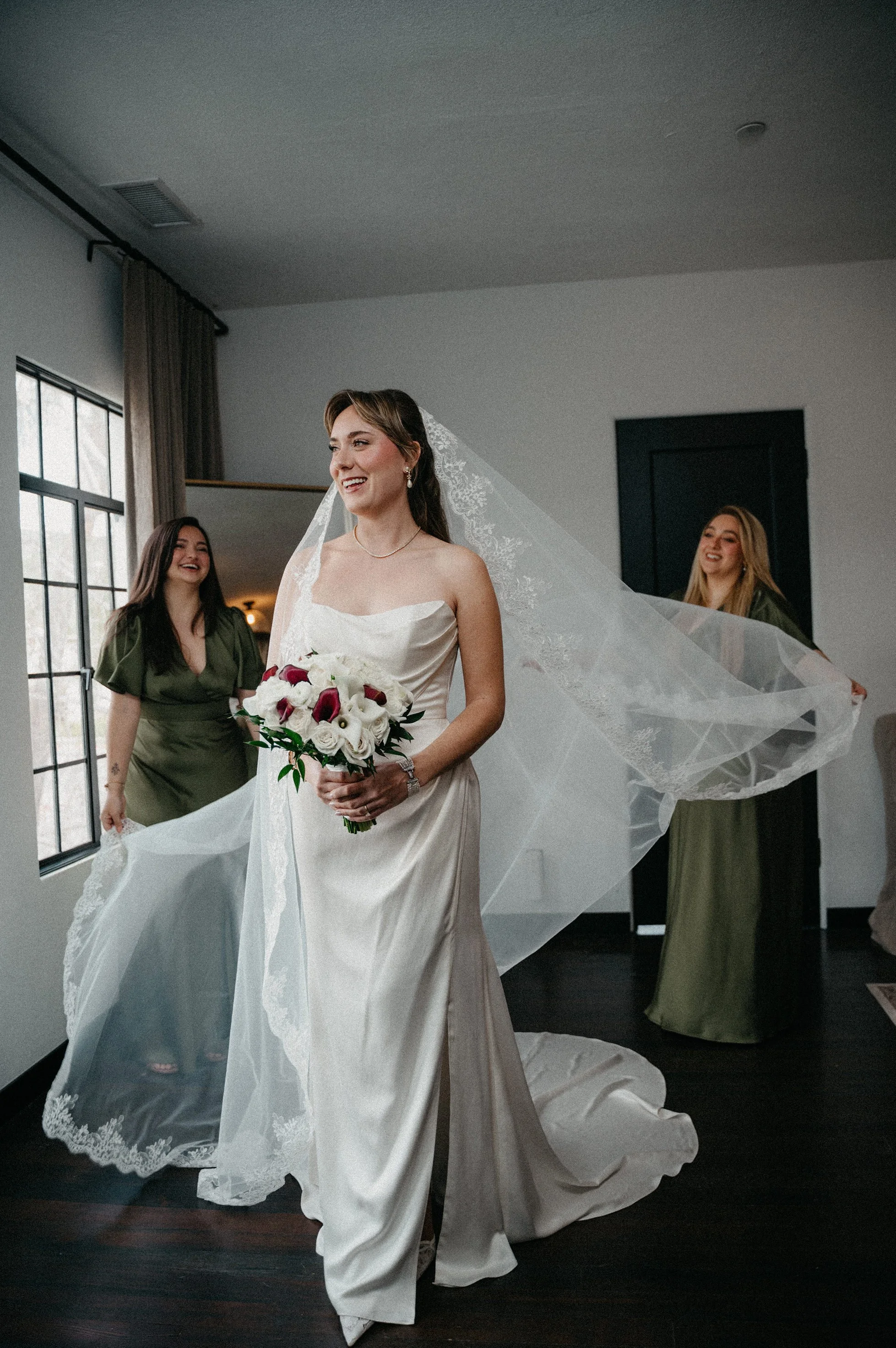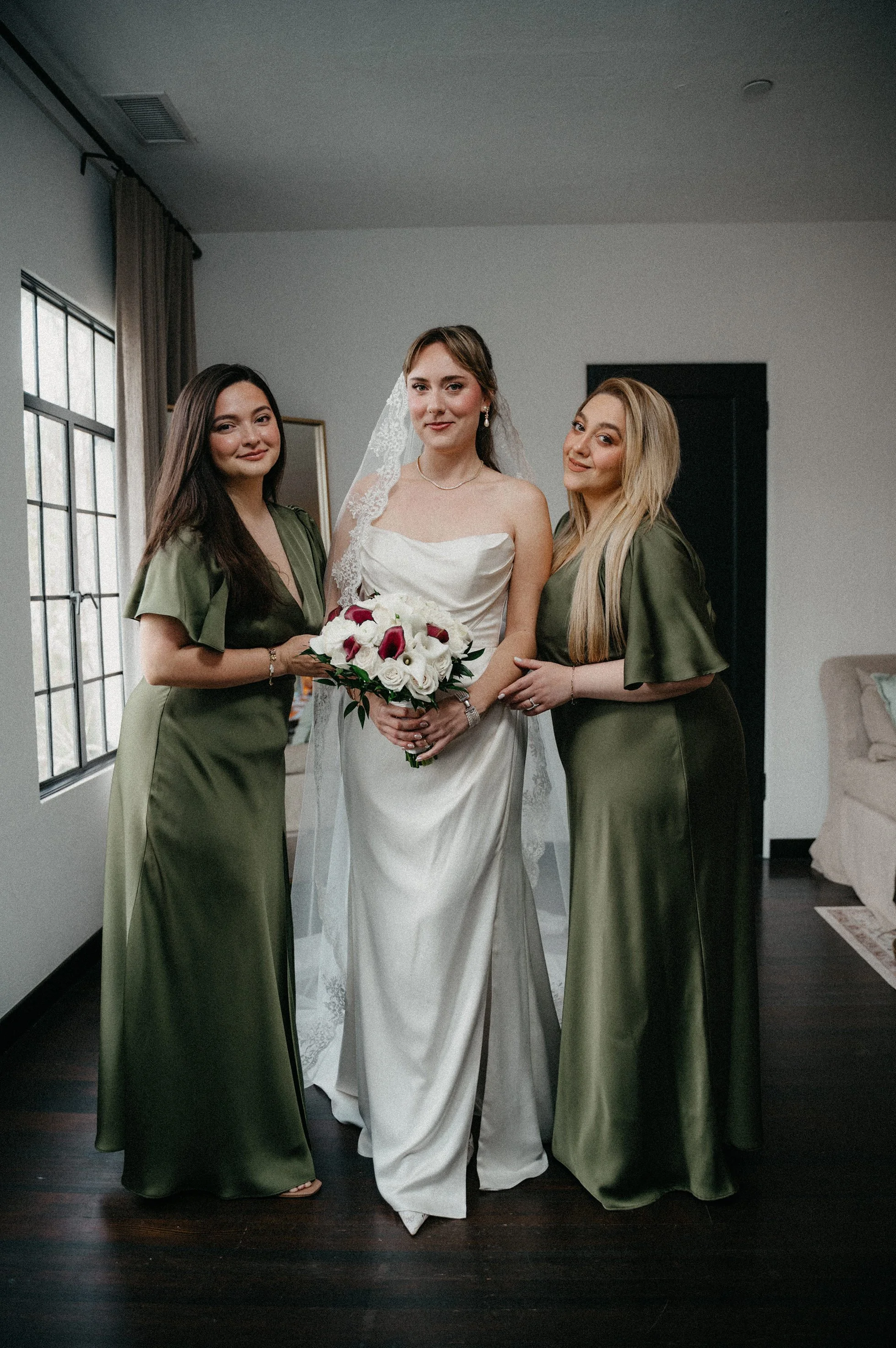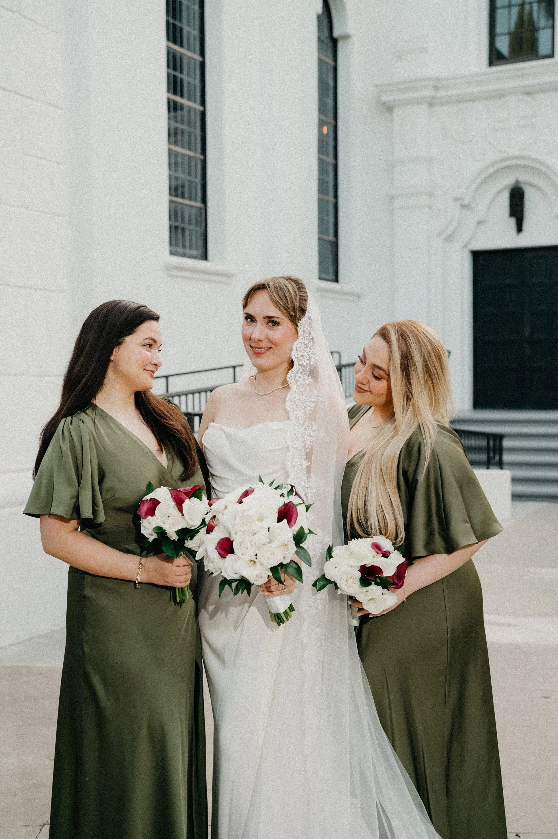 The chapel also offers beautiful natural window light for bridal details and portraits. From the beginning of the day, the aesthetic was clean and classic with a soft, romantic color palette: white florals with olive and sage green accents.