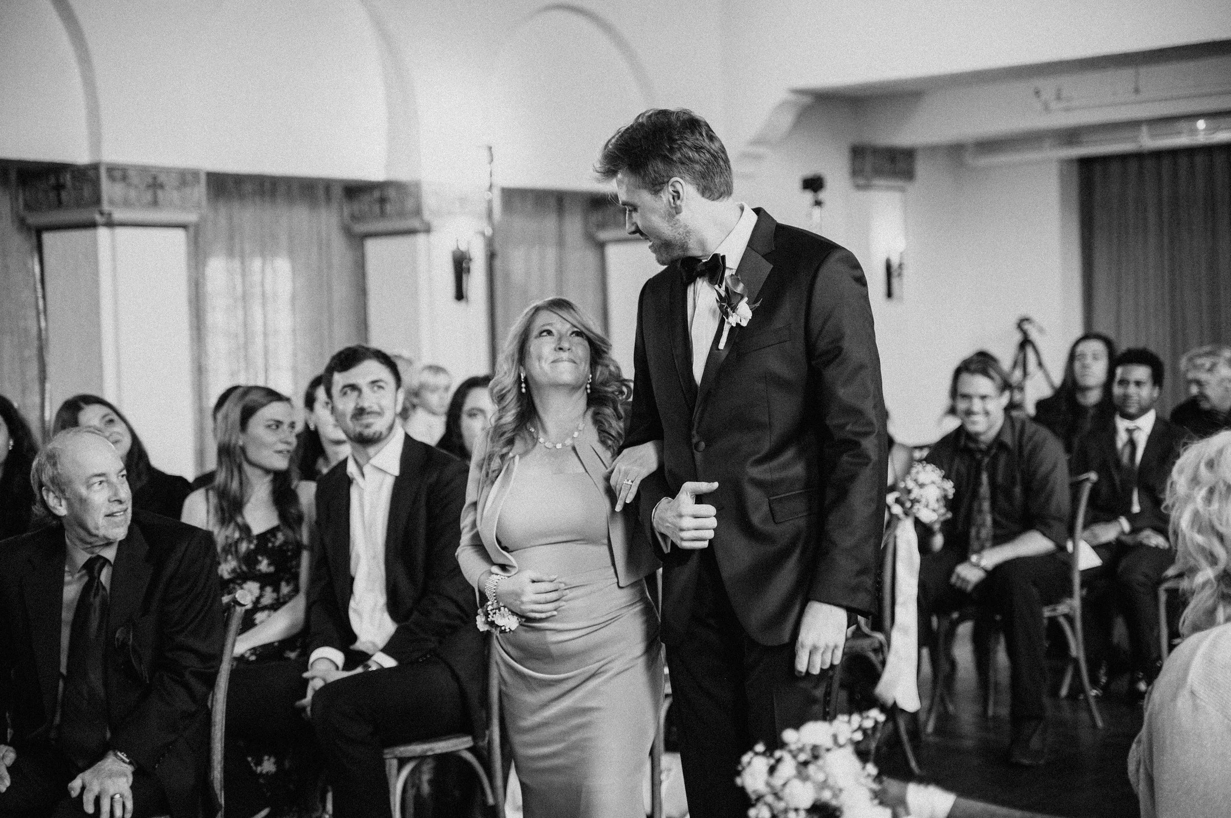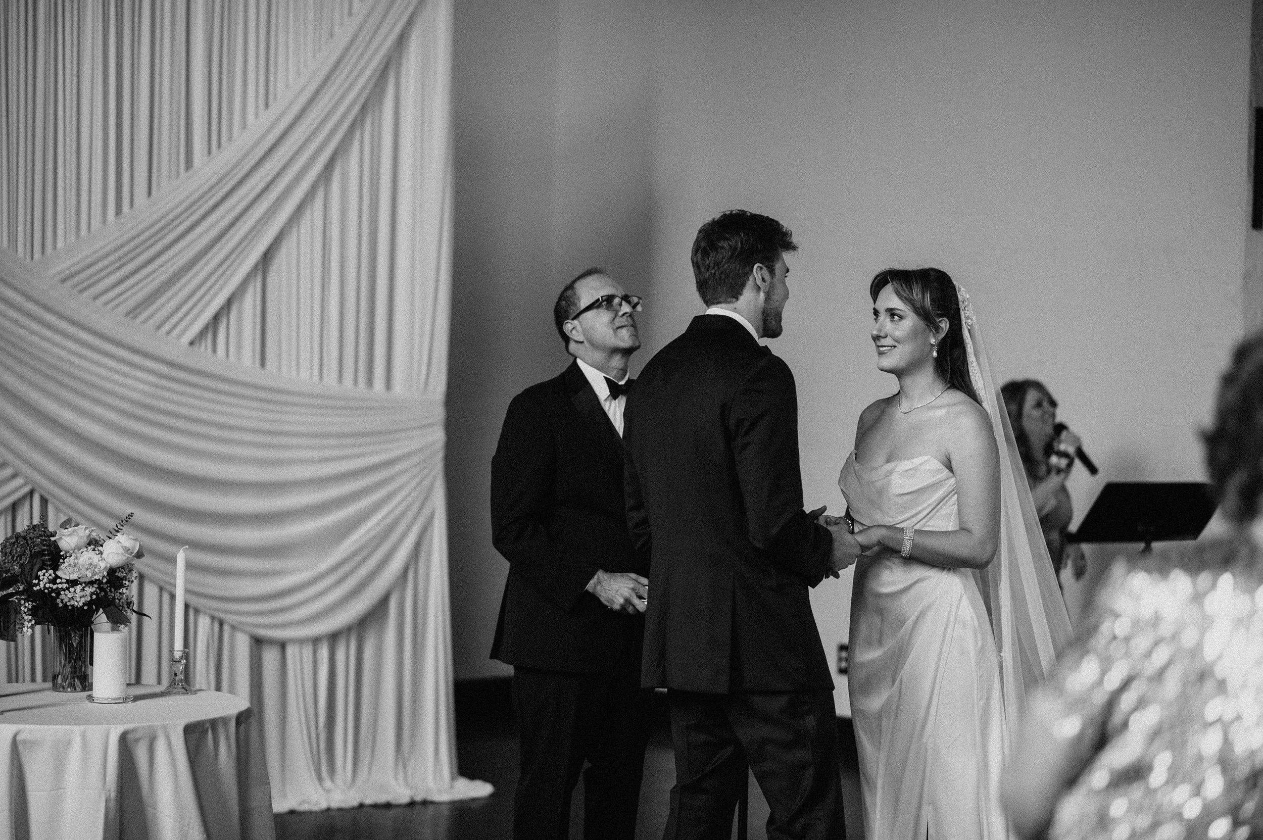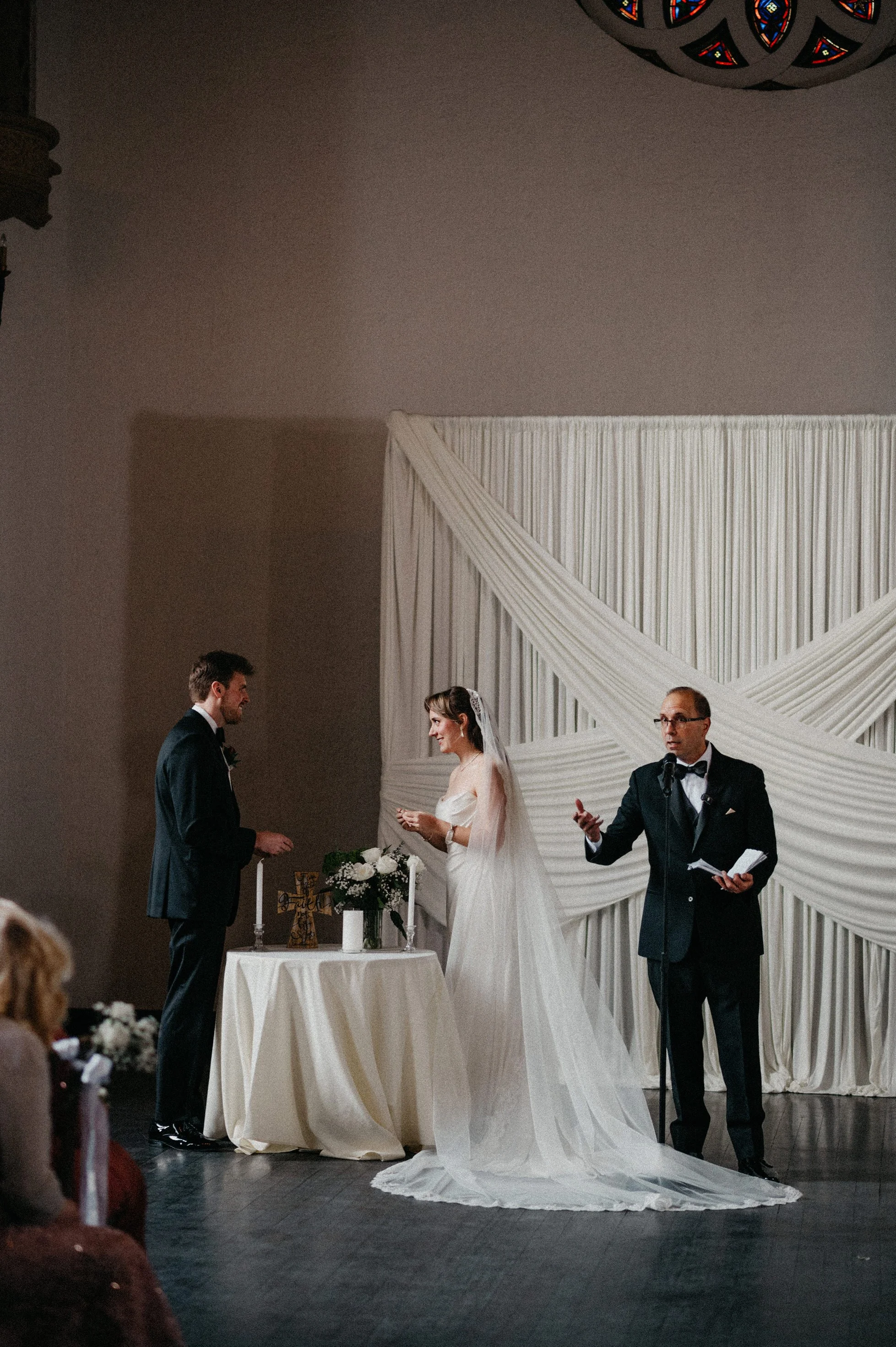 Because of the weather, the ceremony was moved indoors — which honestly worked perfectly because it’s a chapel. The space was made for meaningful ceremony photos: beautiful depth, clean lines, and that timeless atmosphere.
