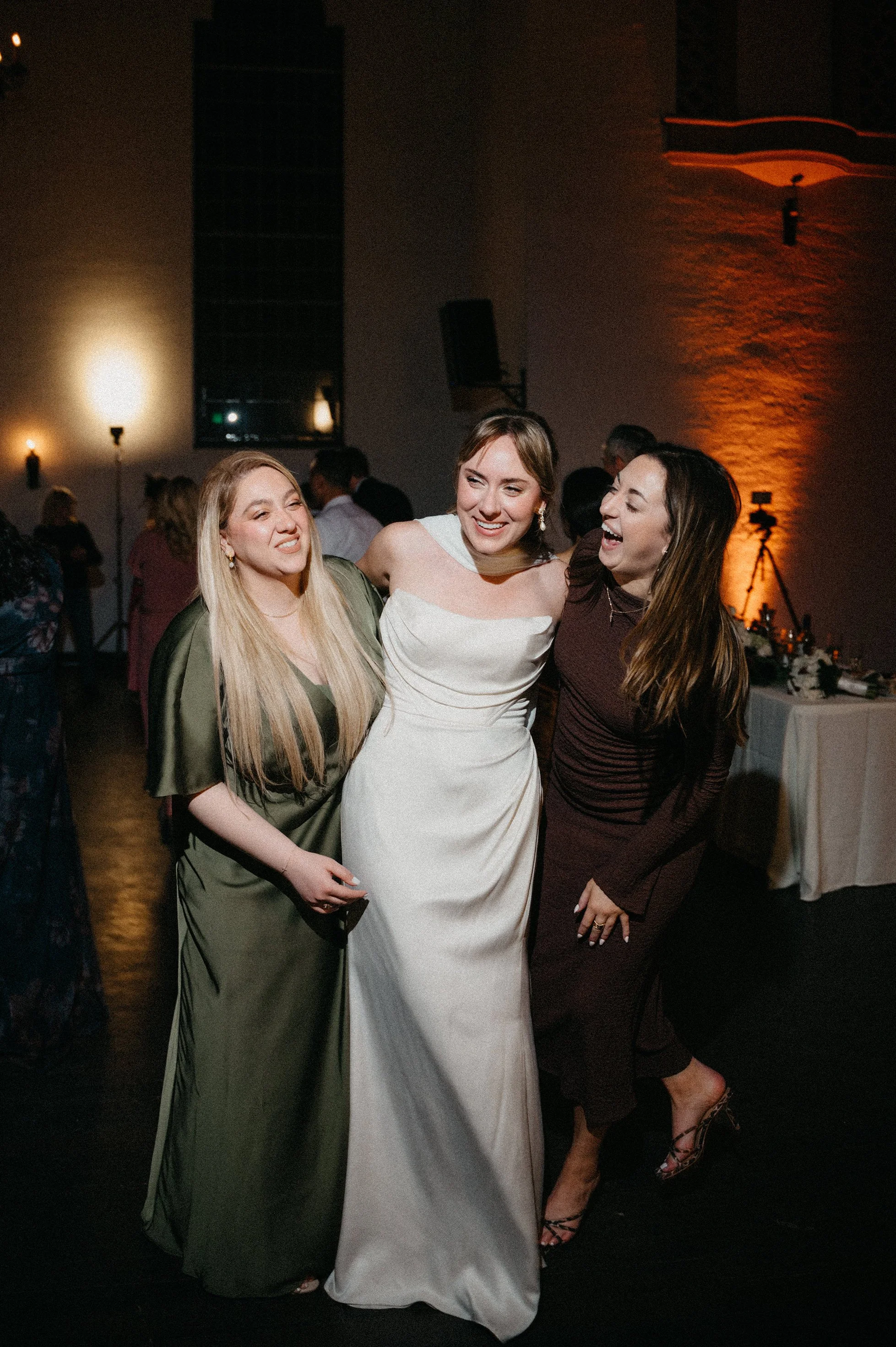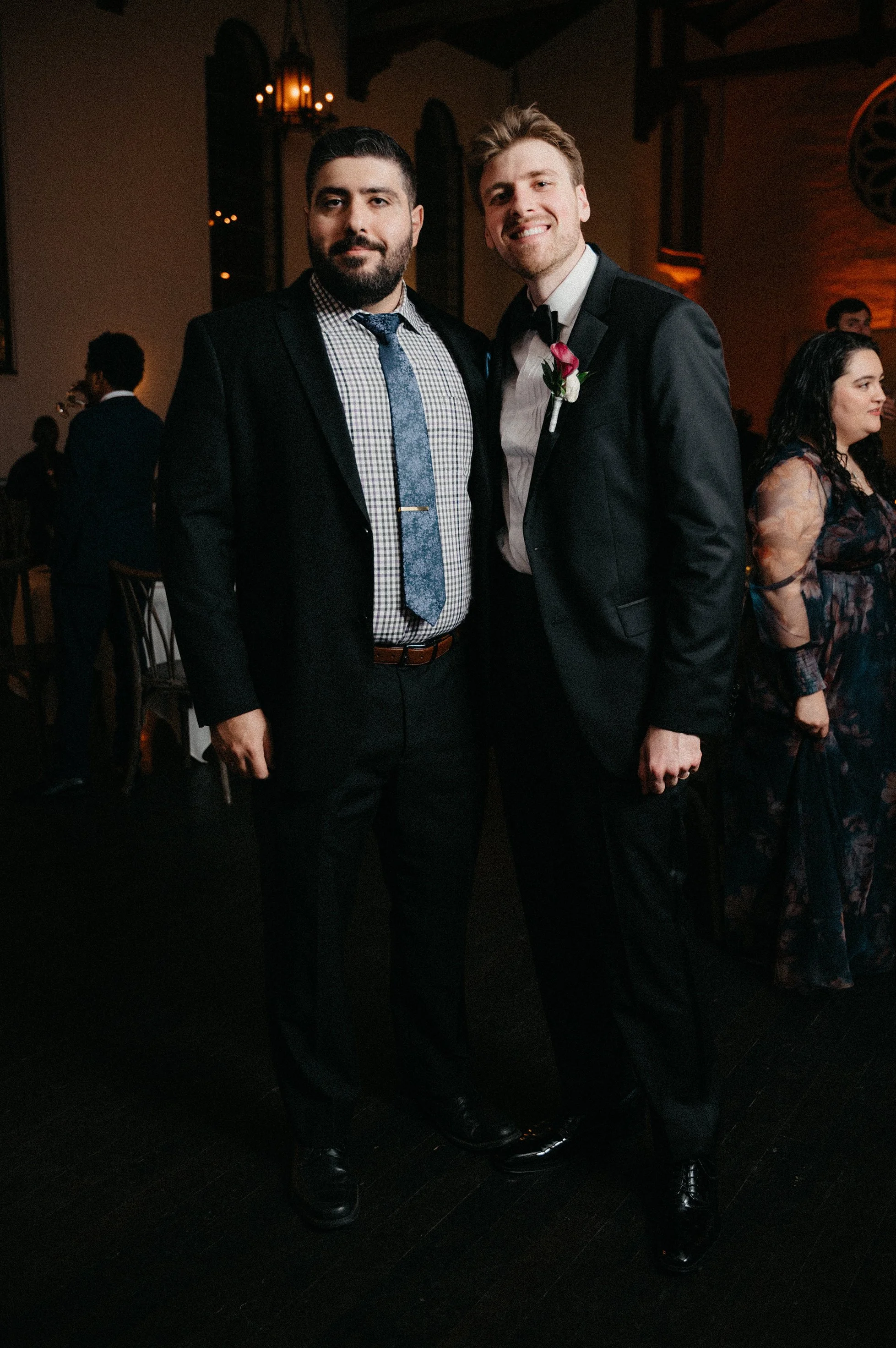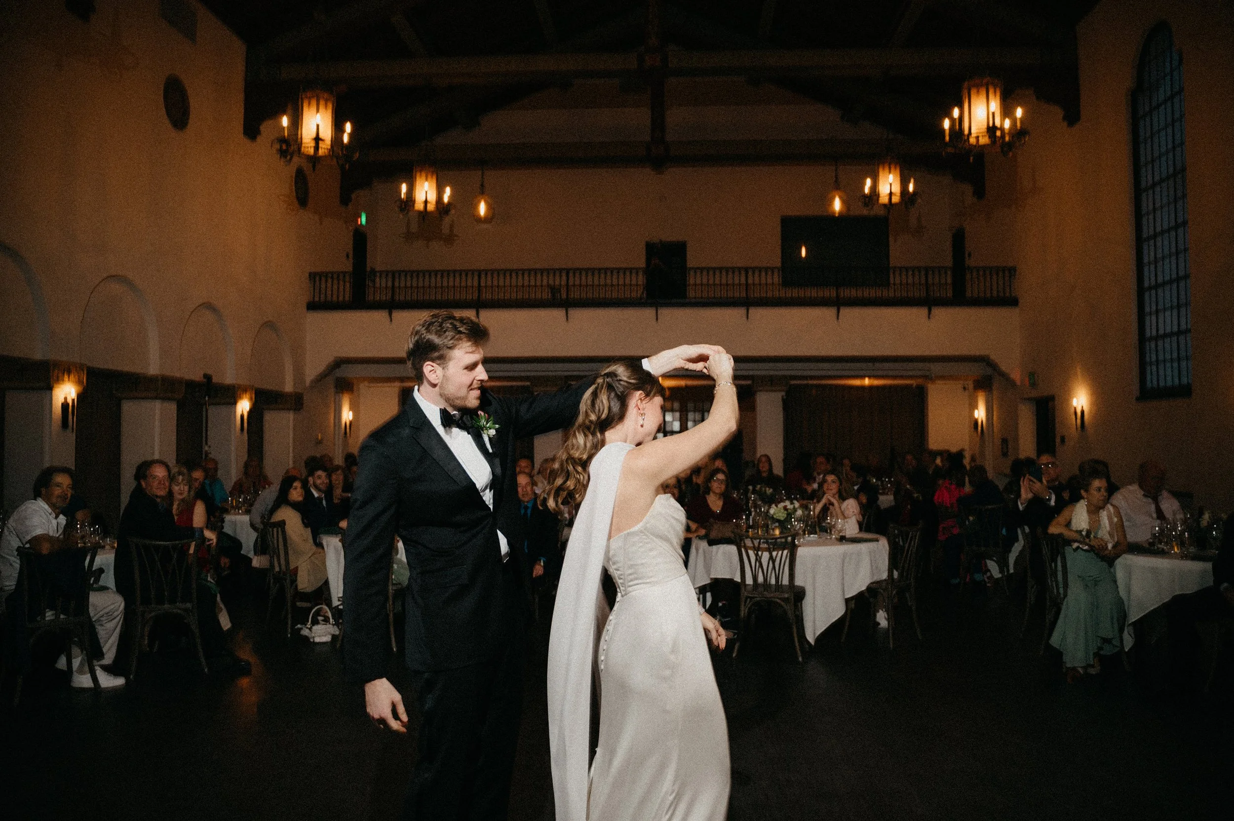 We also took some dramatic couple portraits on the second-floor balcony with the chapel rafters behind them — a moody, cinematic look that balanced perfectly with all the playful energy of the day.