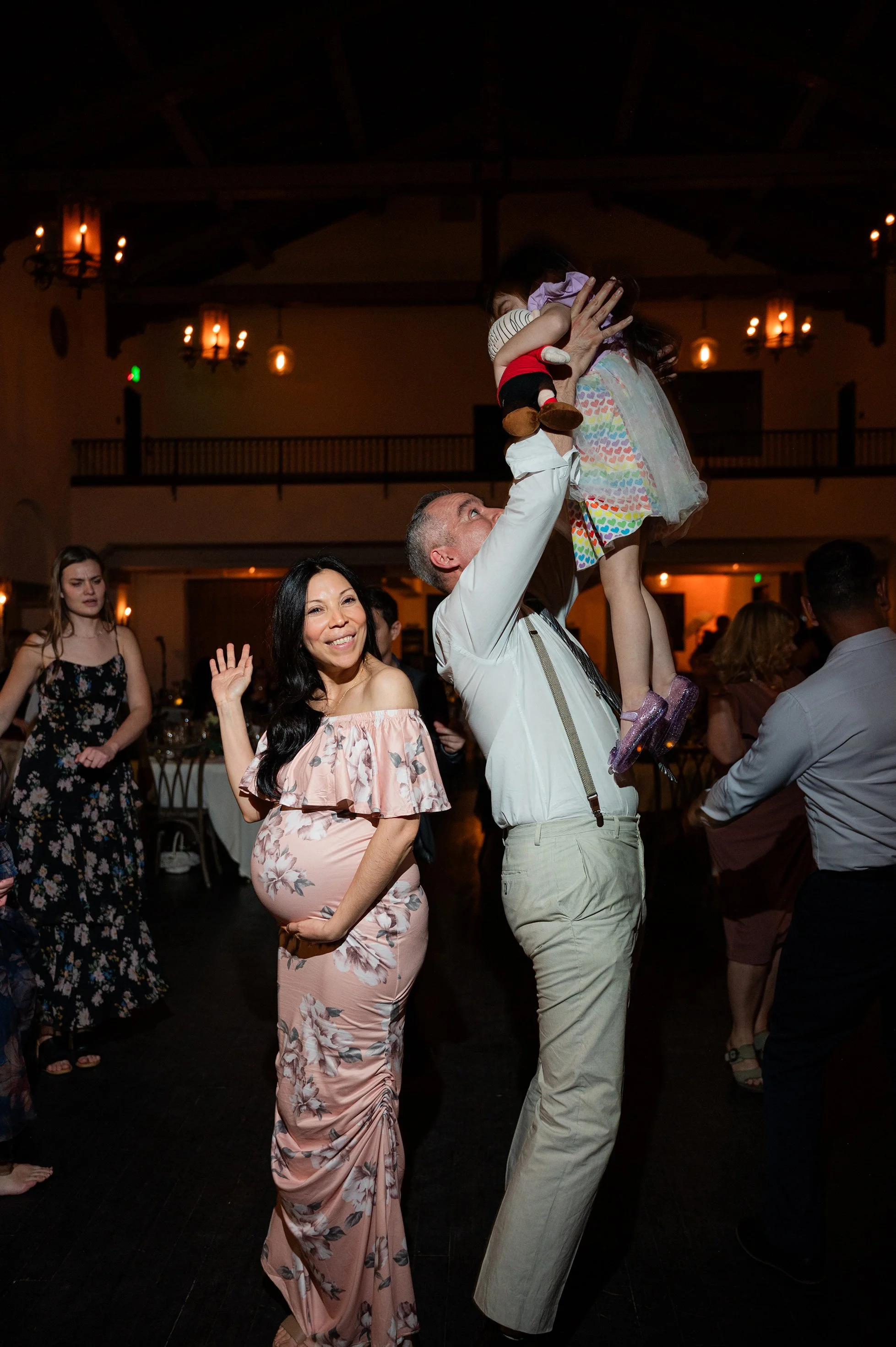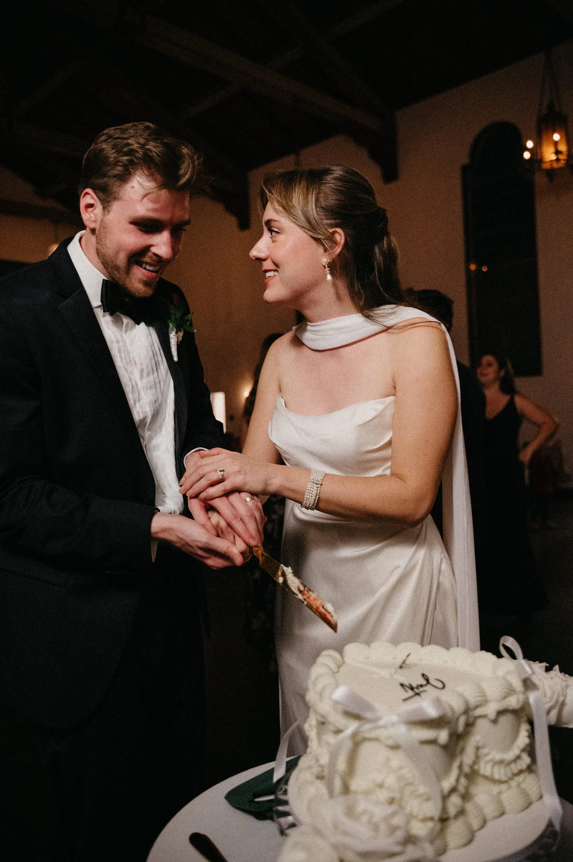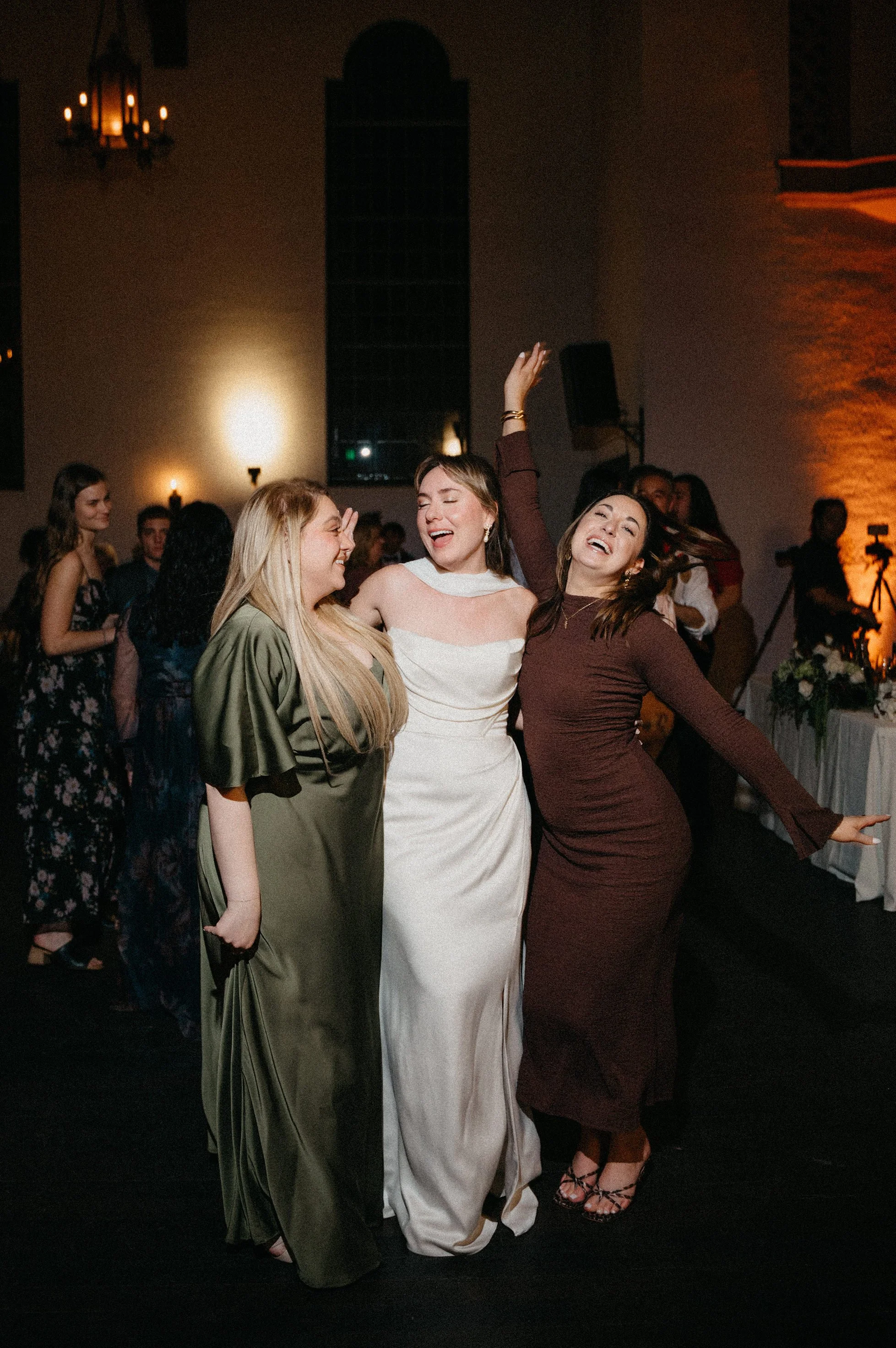 We also took some dramatic couple portraits on the second-floor balcony with the chapel rafters behind them — a moody, cinematic look that balanced perfectly with all the playful energy of the day.