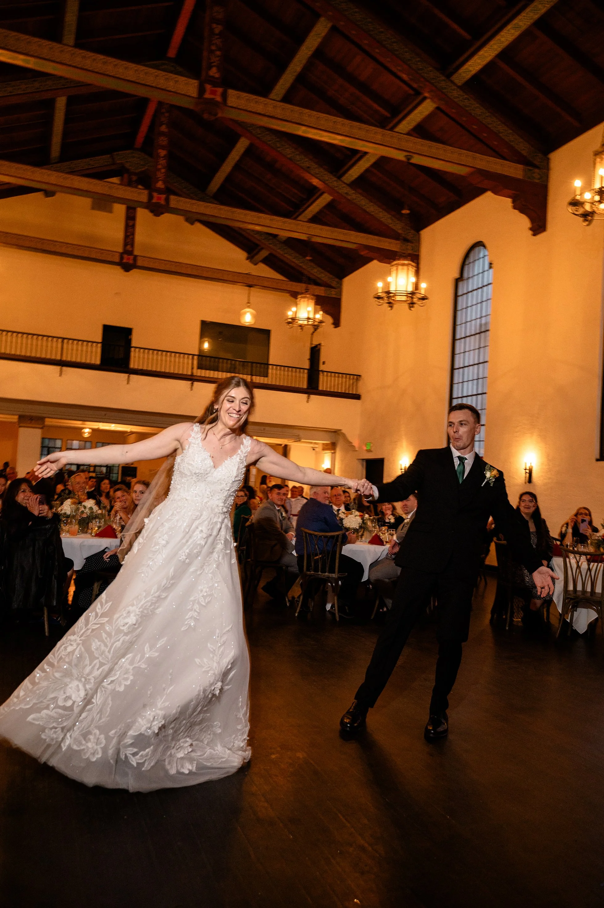 We also took some dramatic couple portraits on the second-floor balcony with the chapel rafters behind them — a moody, cinematic look that balanced perfectly with all the playful energy of the day.