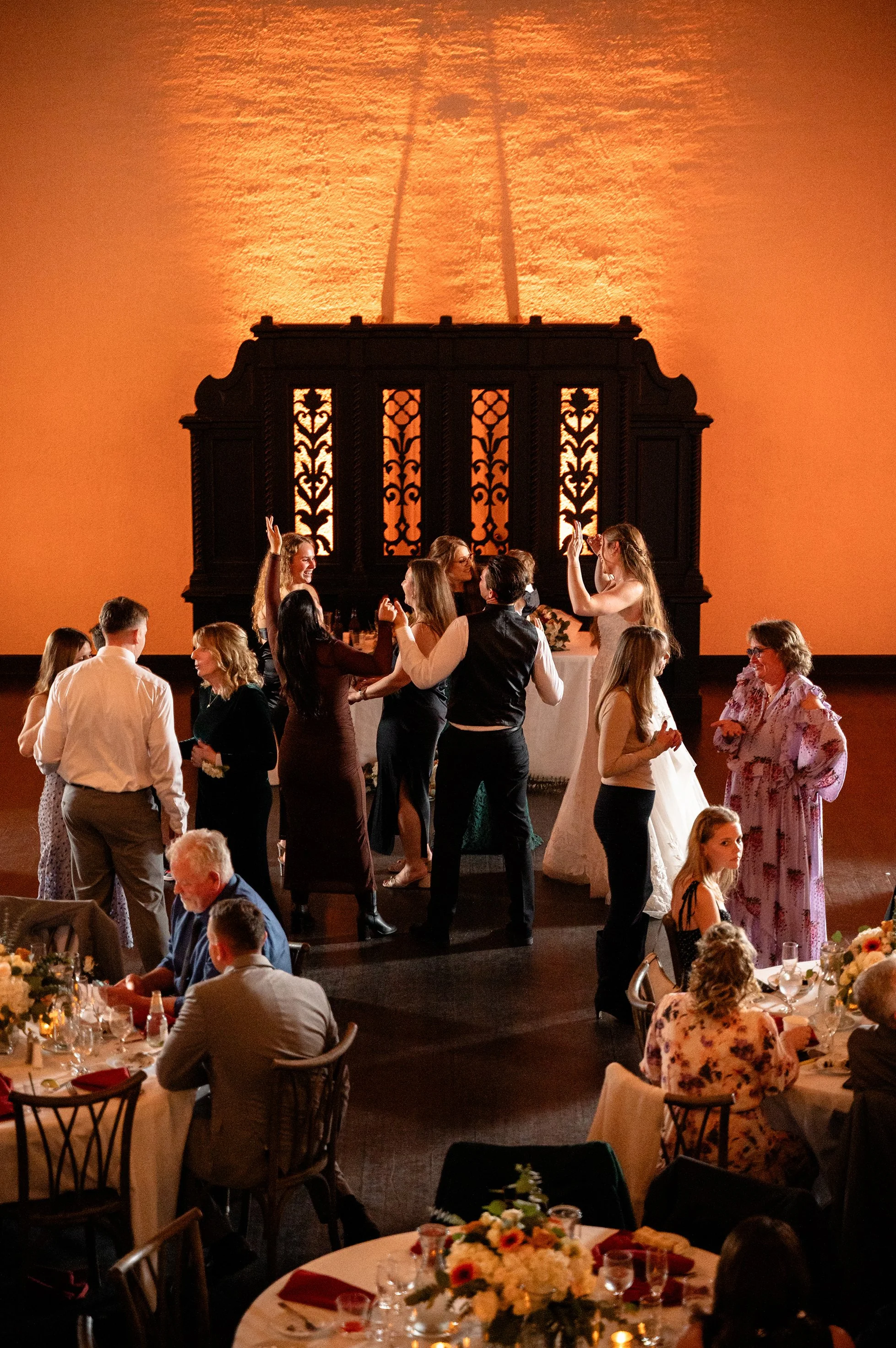 Reception inside the Fillmore Chapel: donuts, uplighting, and nonstop energy