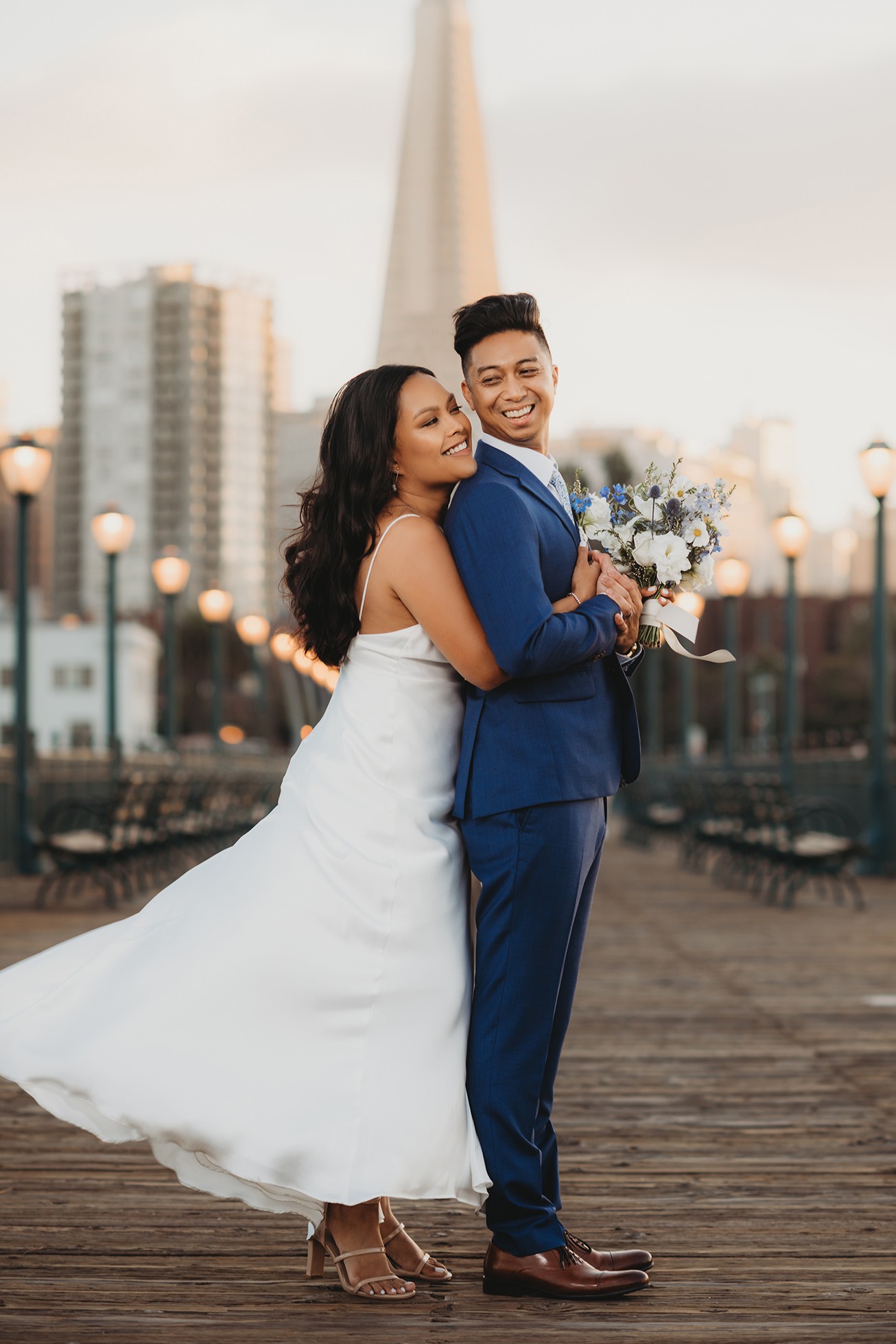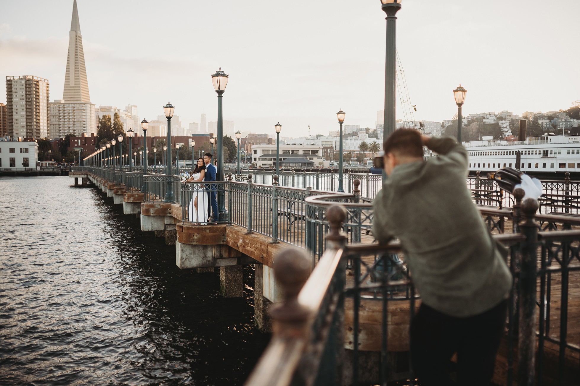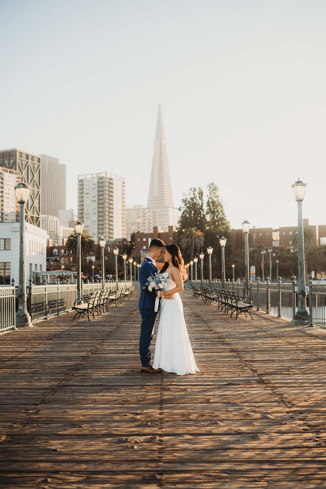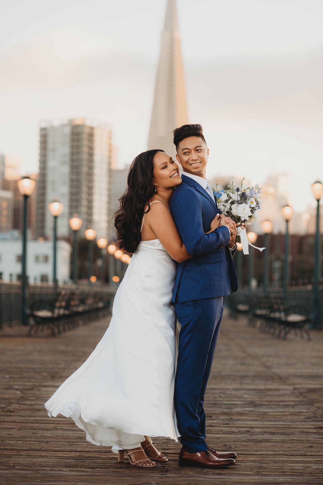 From there, we headed to the San Francisco Pier for sunset portraits. The light was warm, the city felt alive, and the whole pace of the day slowed down in the best way—just the two of them soaking it all in.