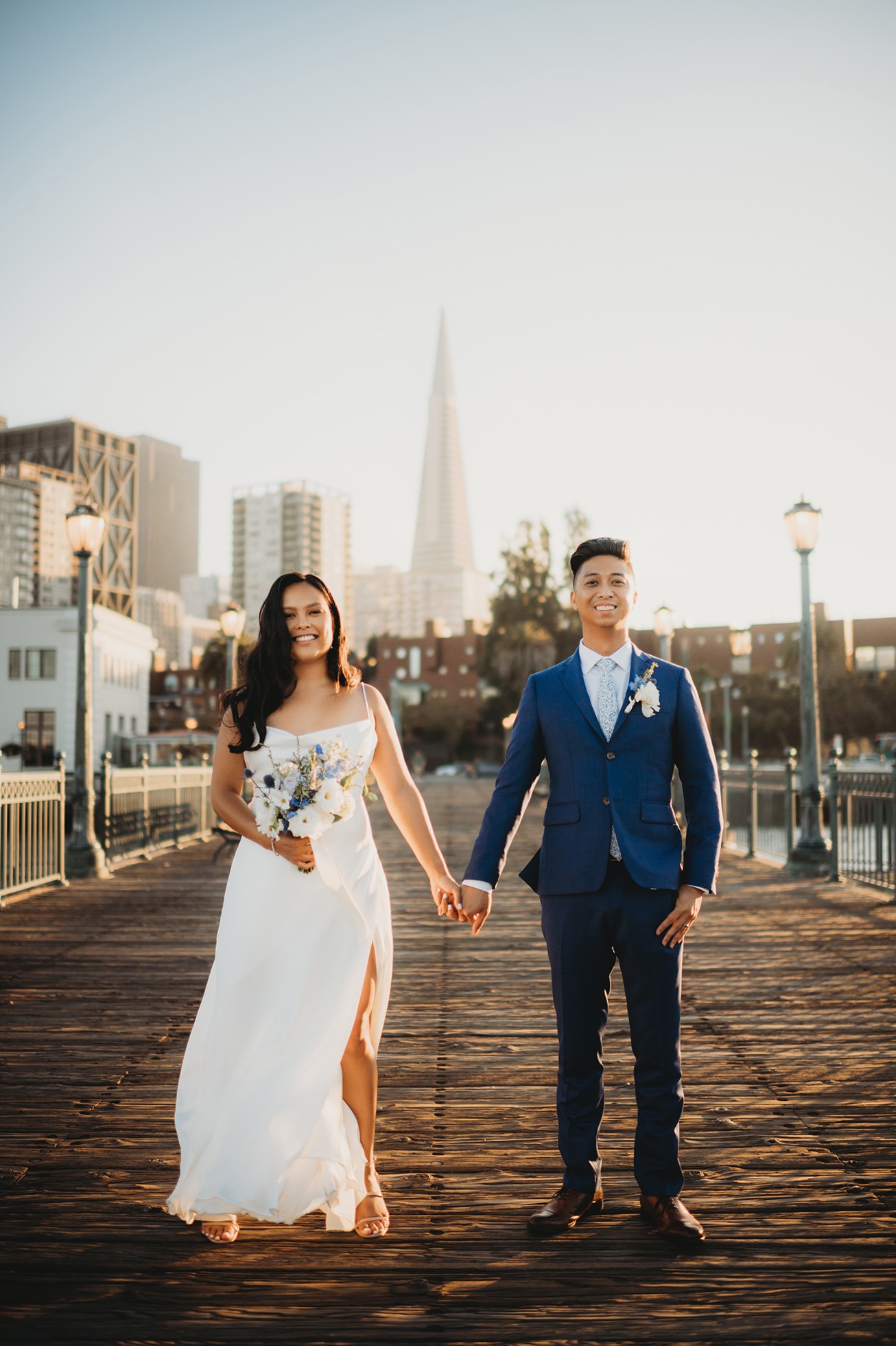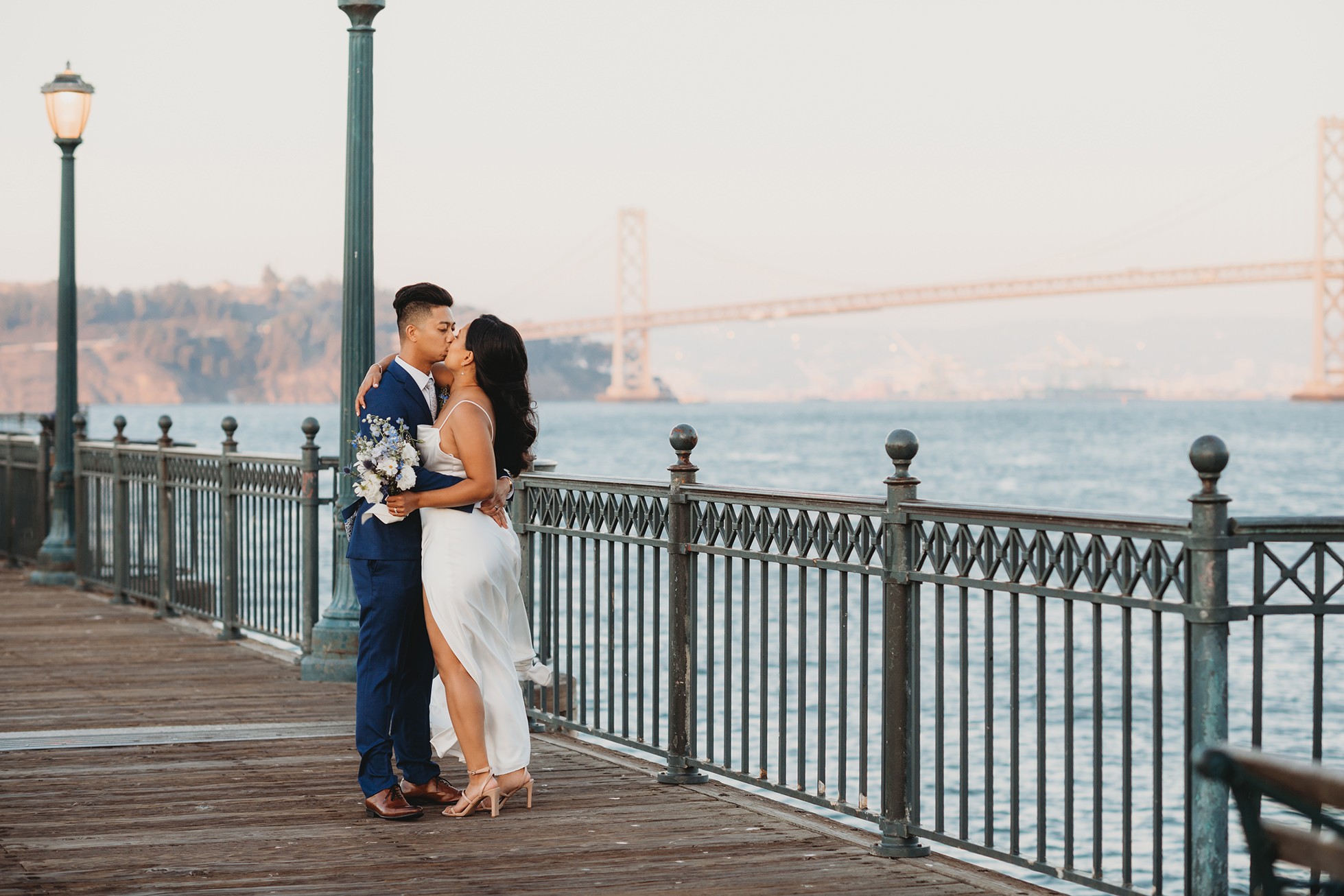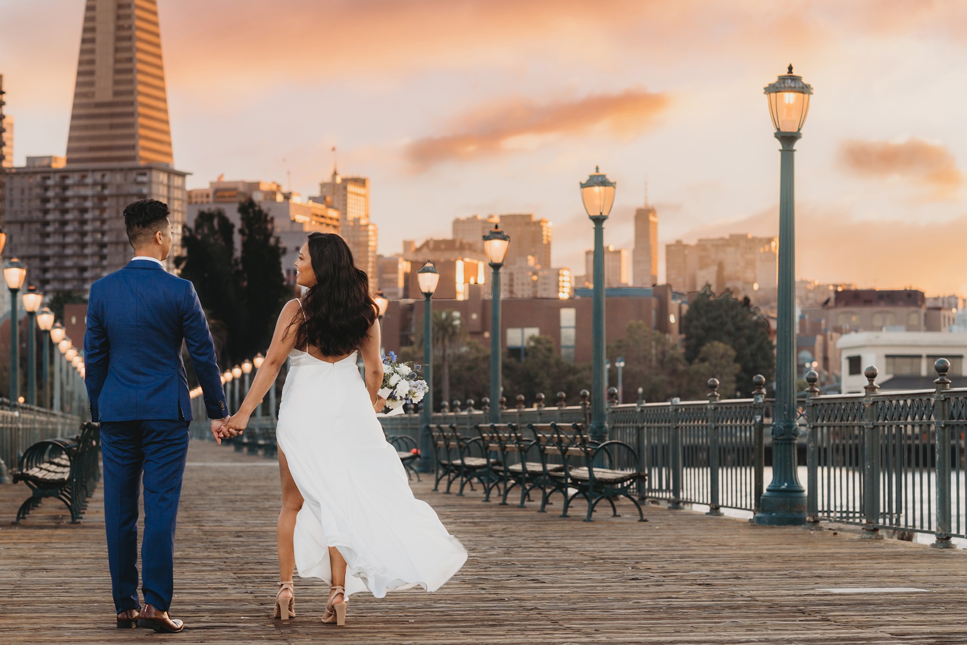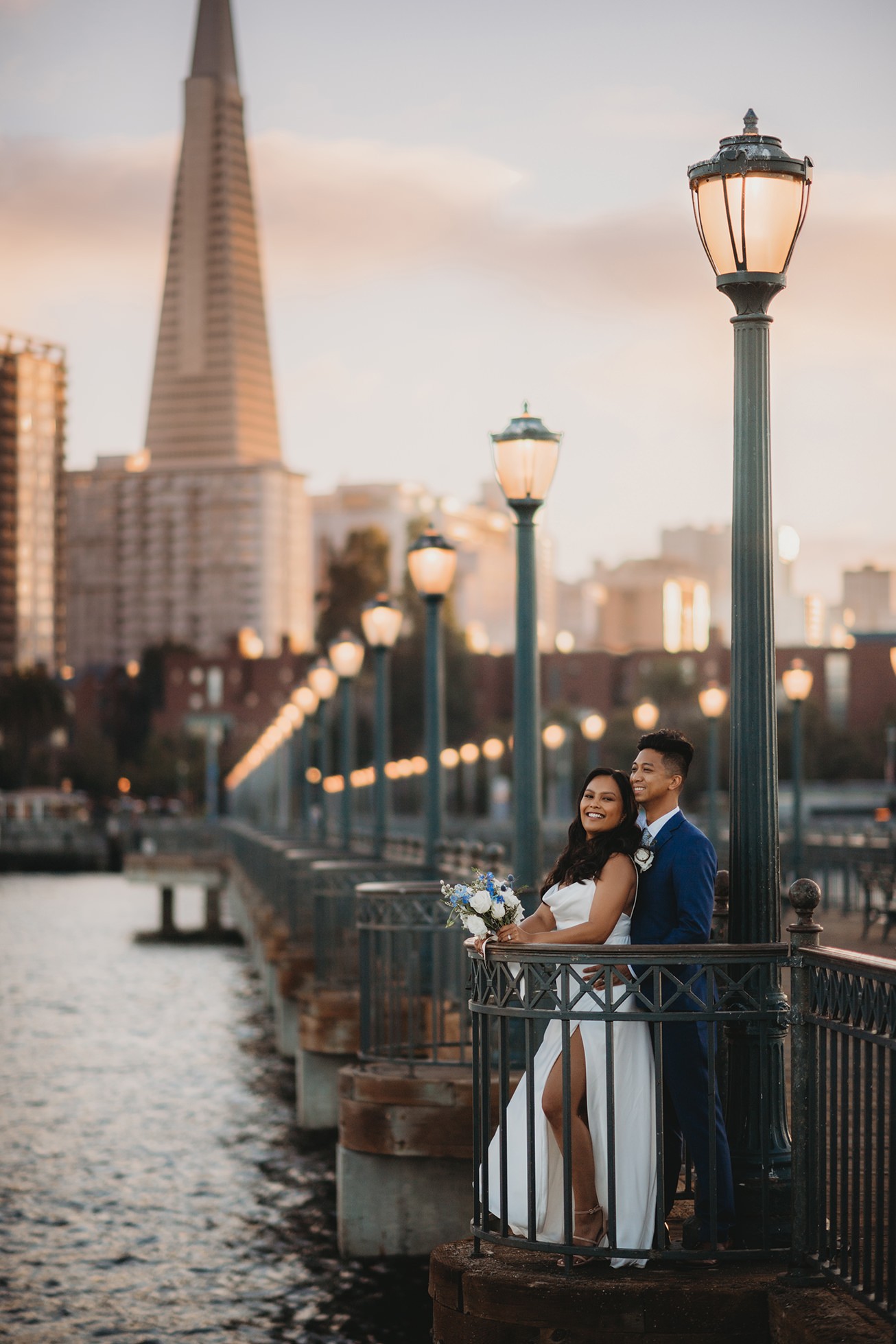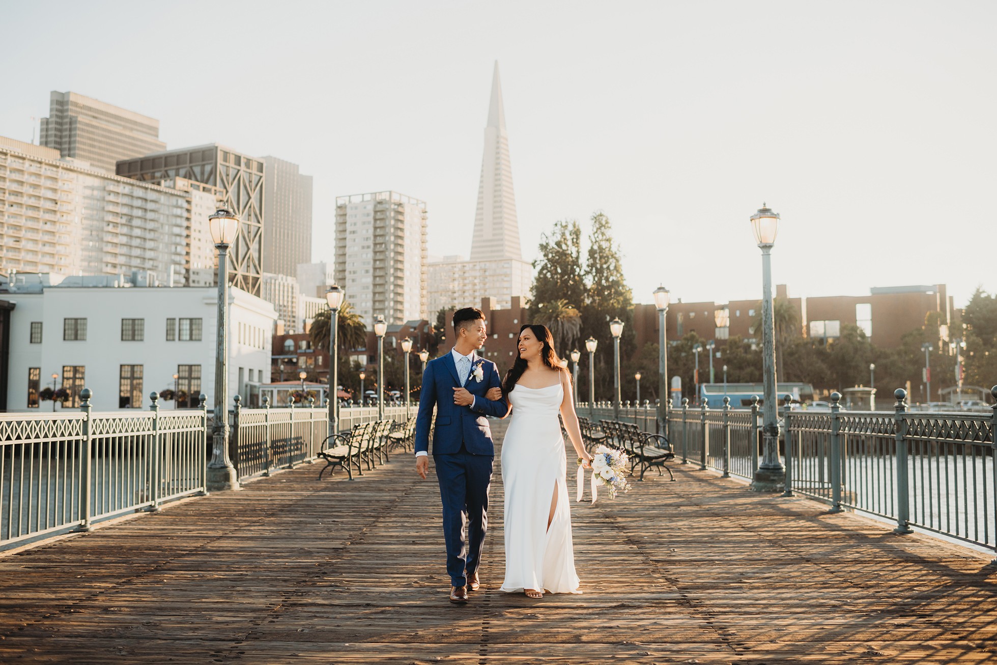 From there, we headed to the San Francisco Pier for sunset portraits. The light was warm, the city felt alive, and the whole pace of the day slowed down in the best way—just the two of them soaking it all in.