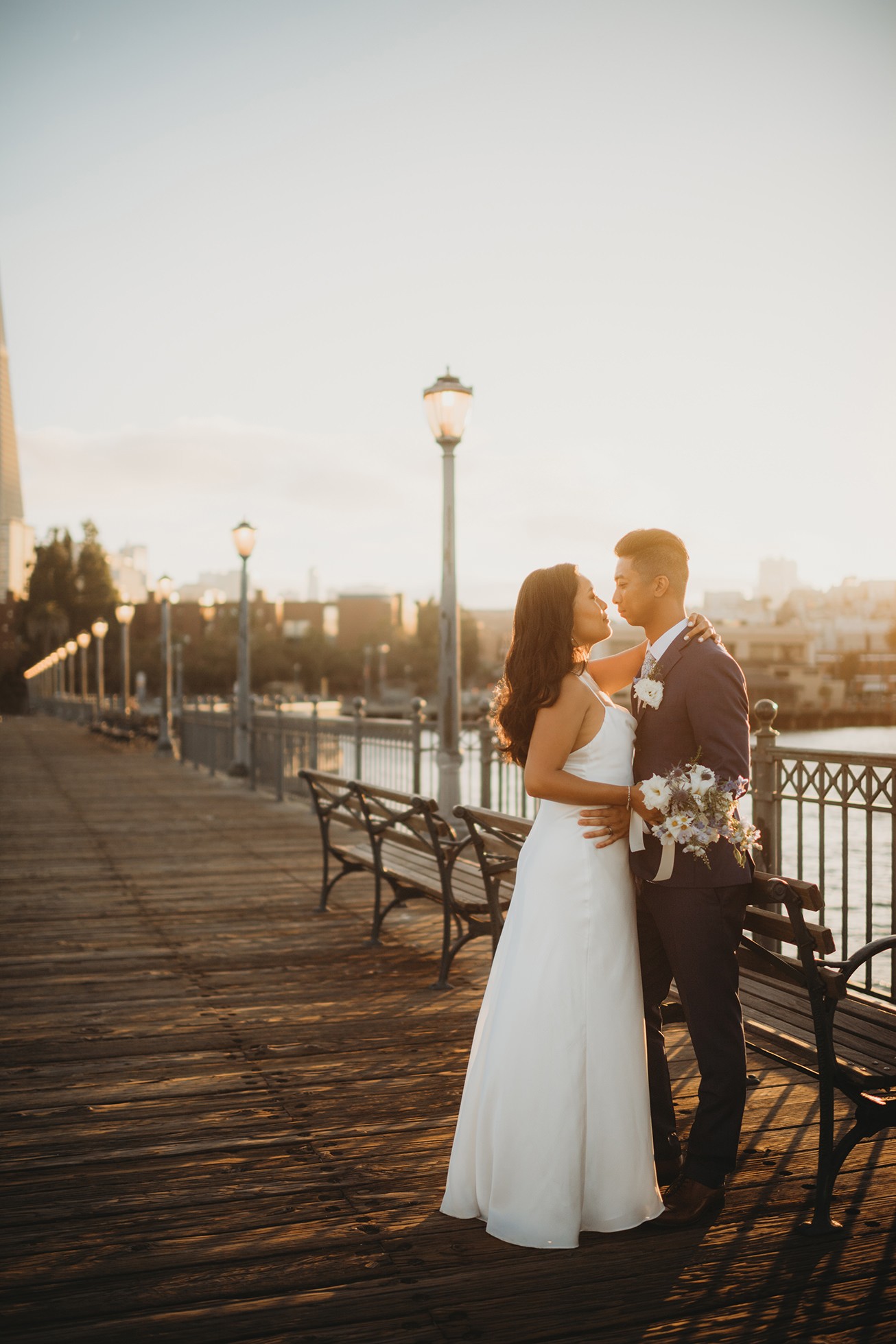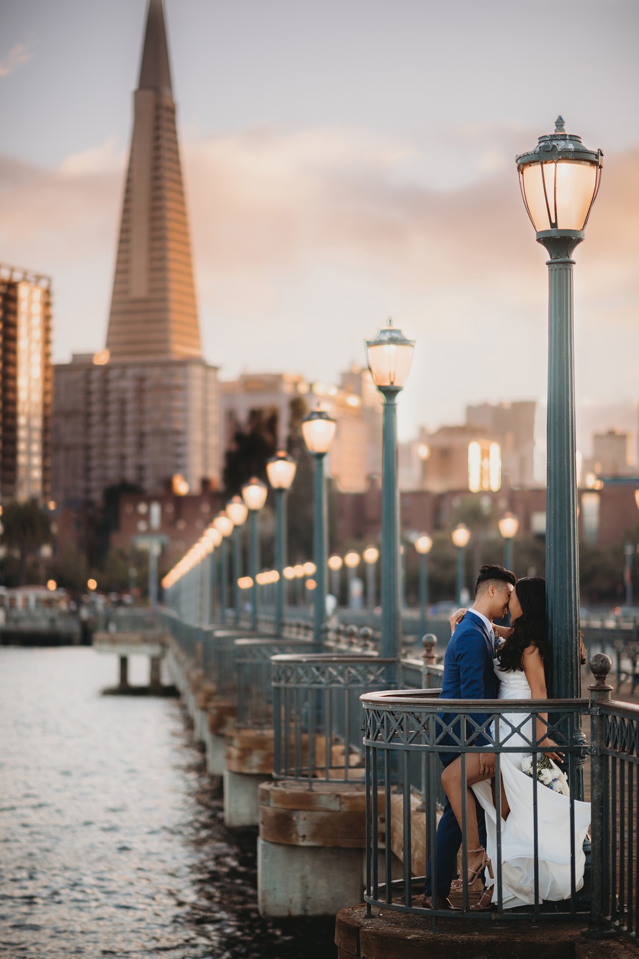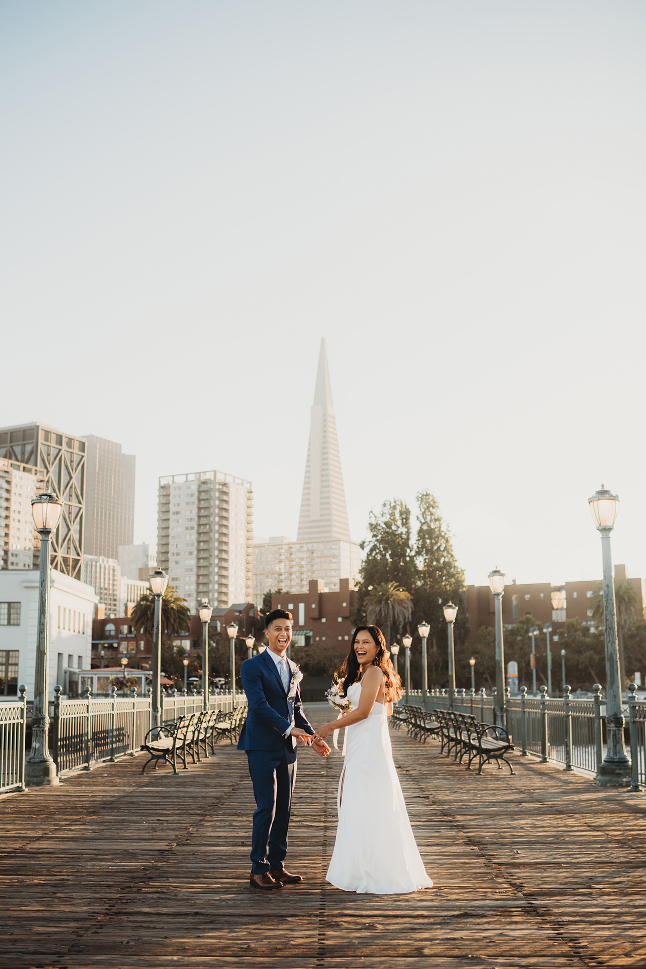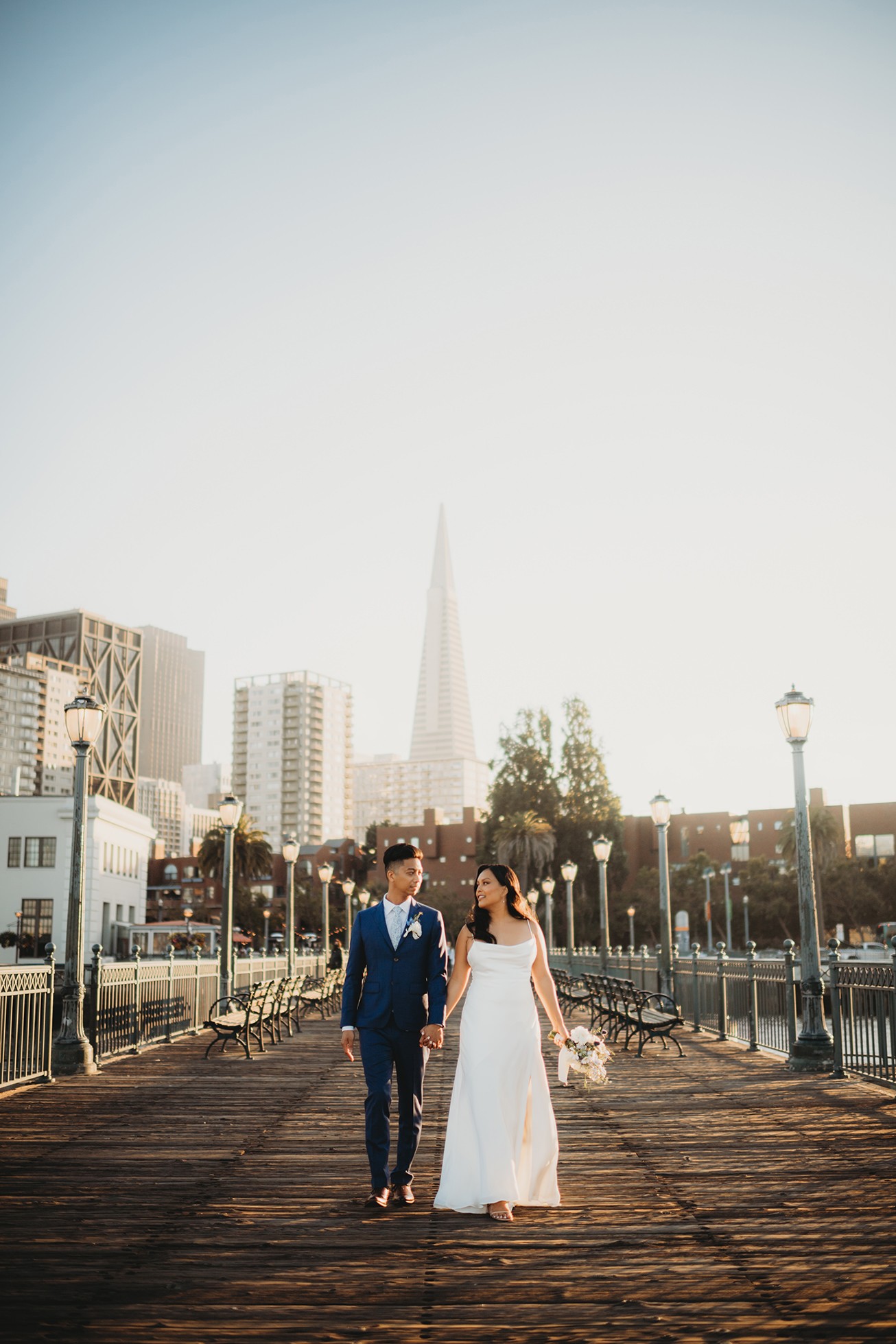 From there, we headed to the San Francisco Pier for sunset portraits. The light was warm, the city felt alive, and the whole pace of the day slowed down in the best way—just the two of them soaking it all in.