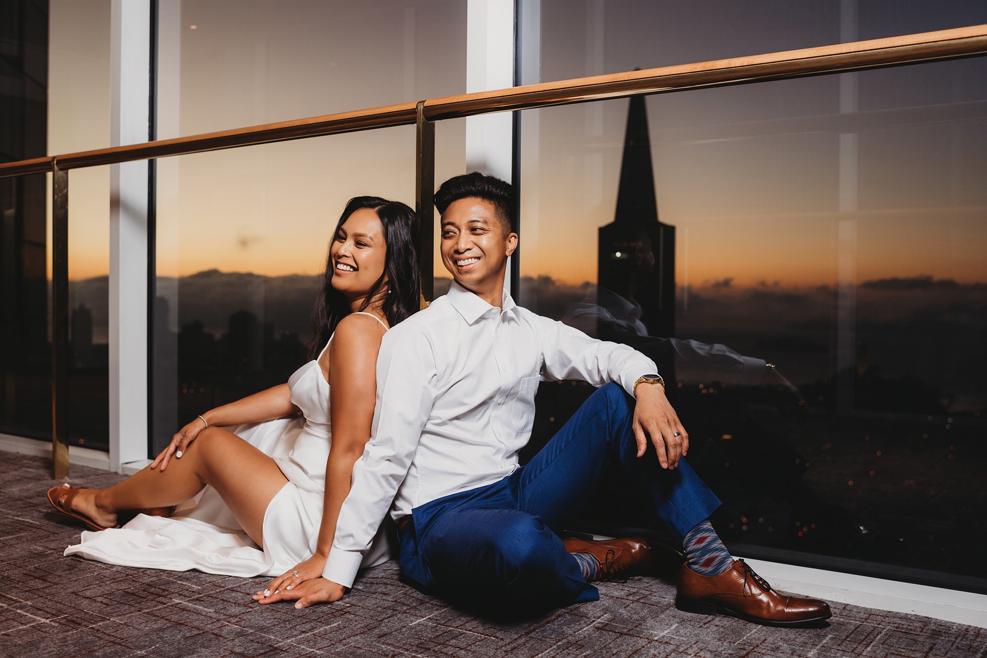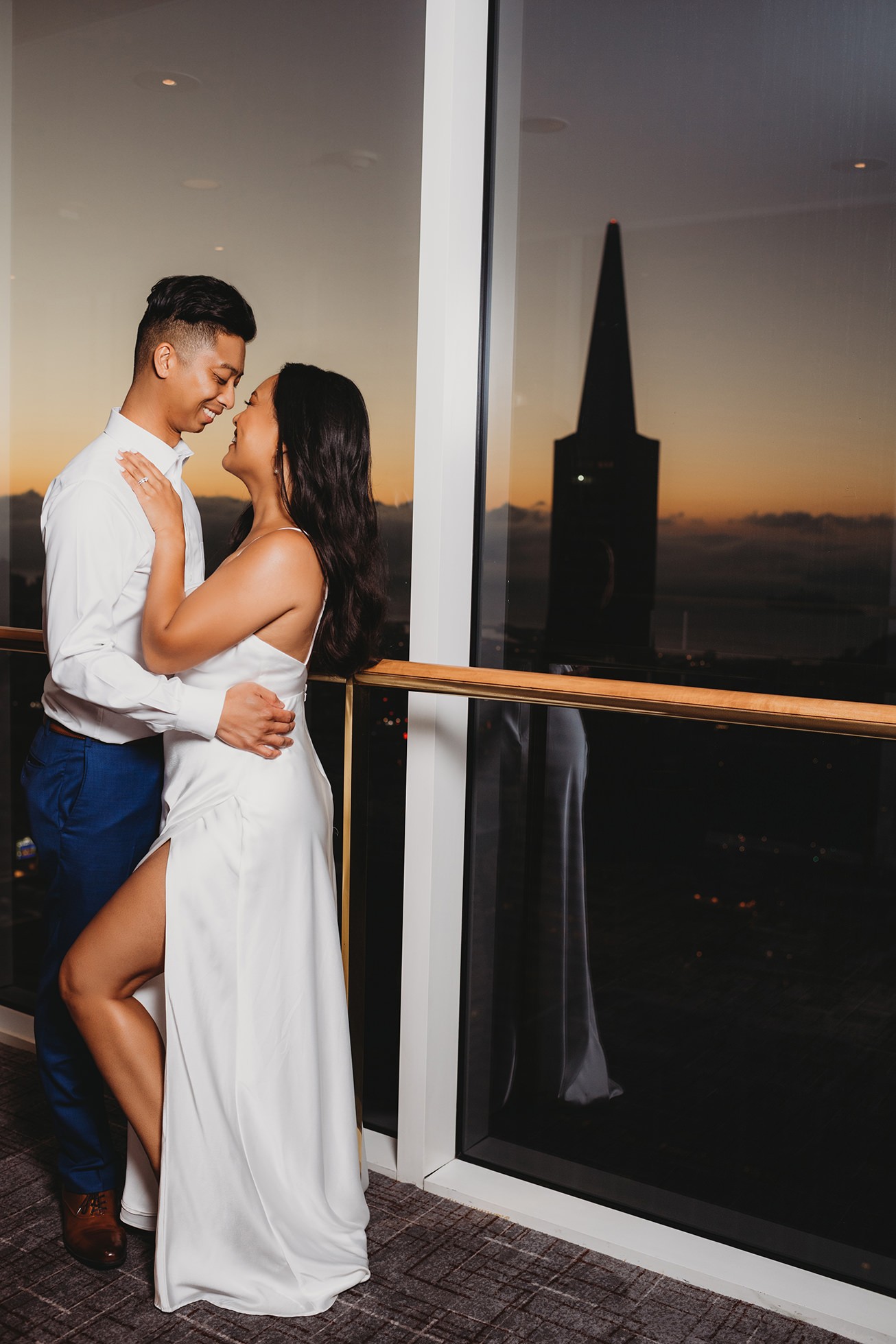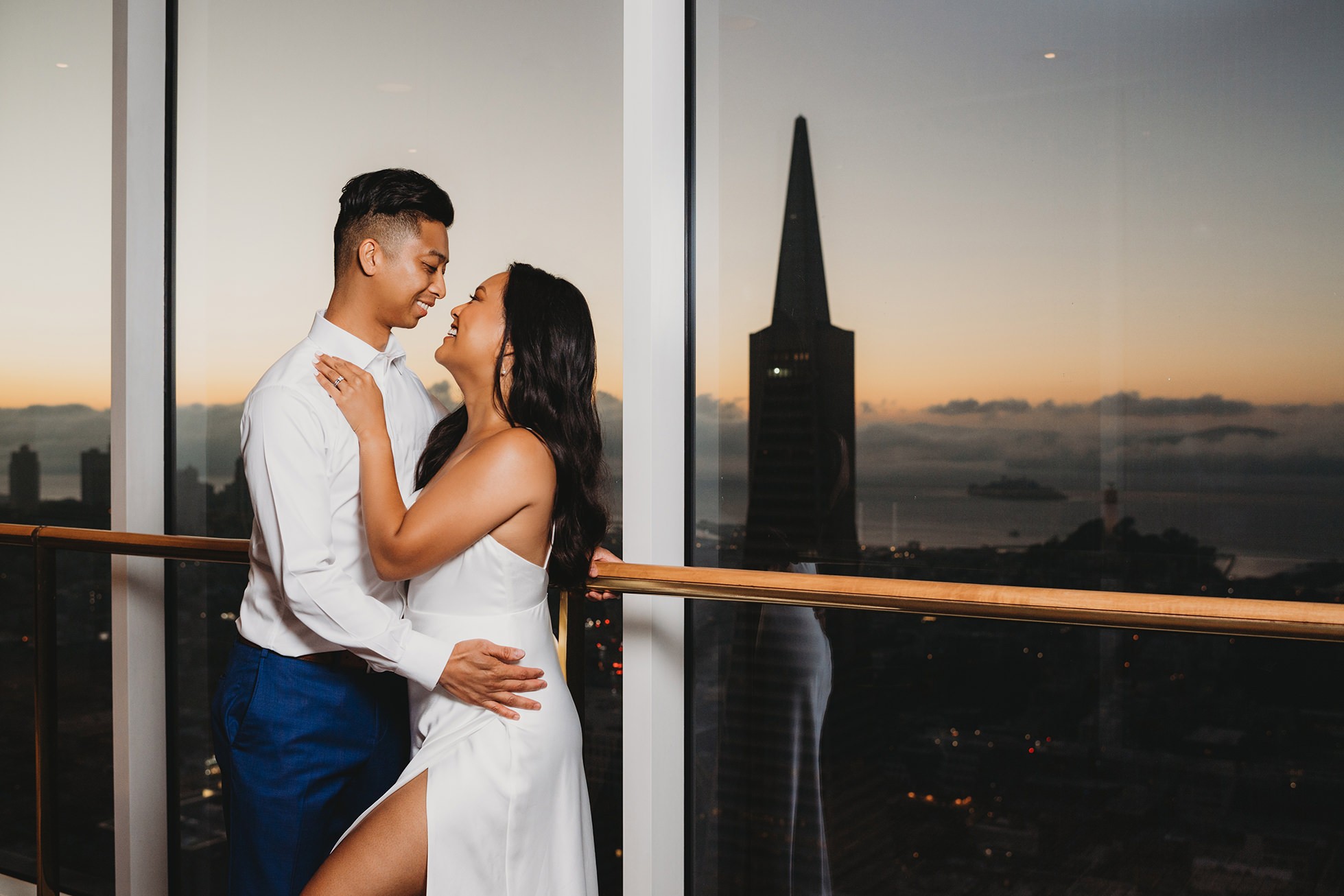 We finished their elopement story back at the hotel in one of the coolest spots: the skybridge hallway with glass walls. The sunset sky showed through the windows, and we were able to feature the San Francisco skyline behind them—an ending that felt modern, stylish, and unmistakably SF.