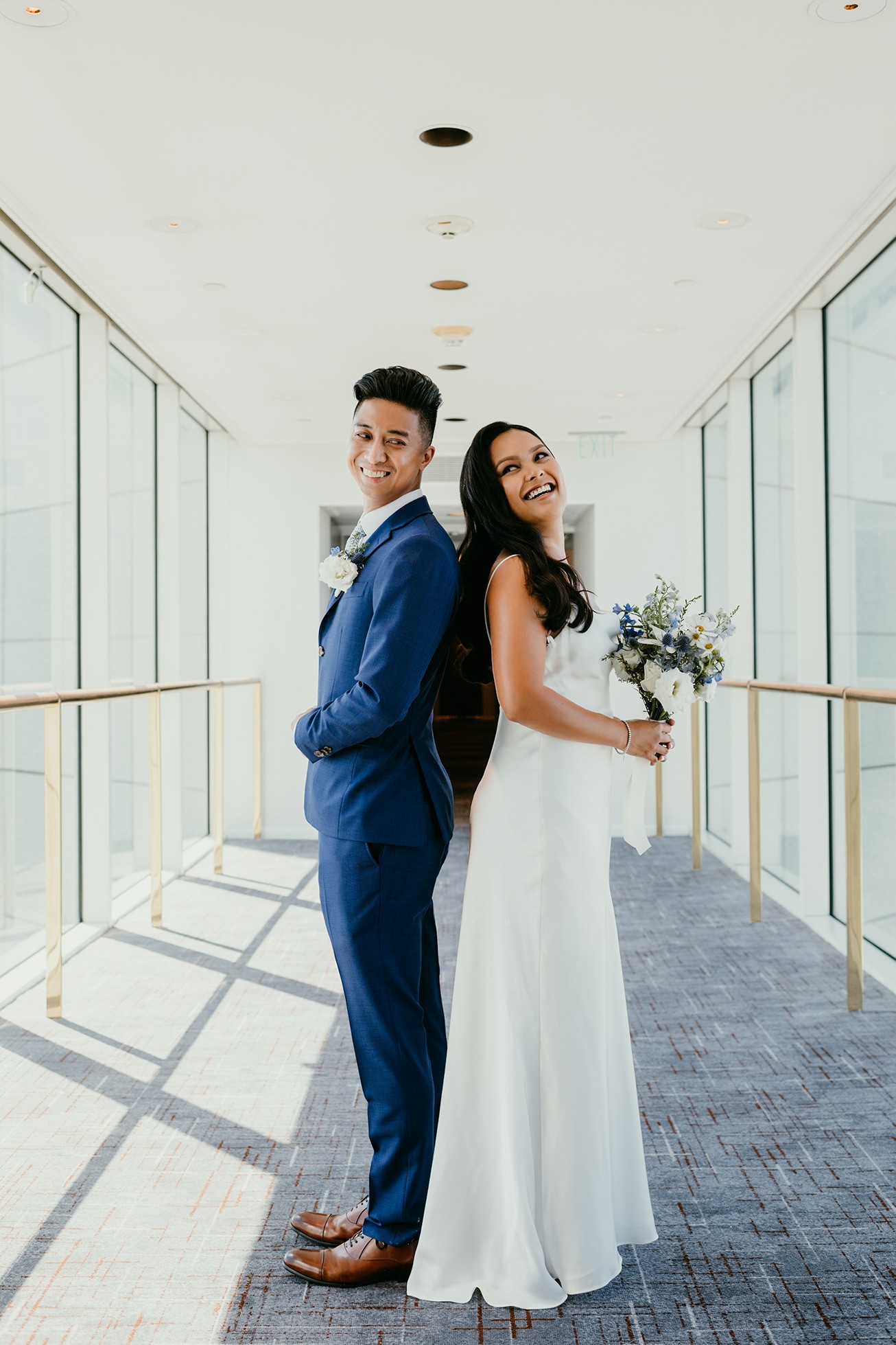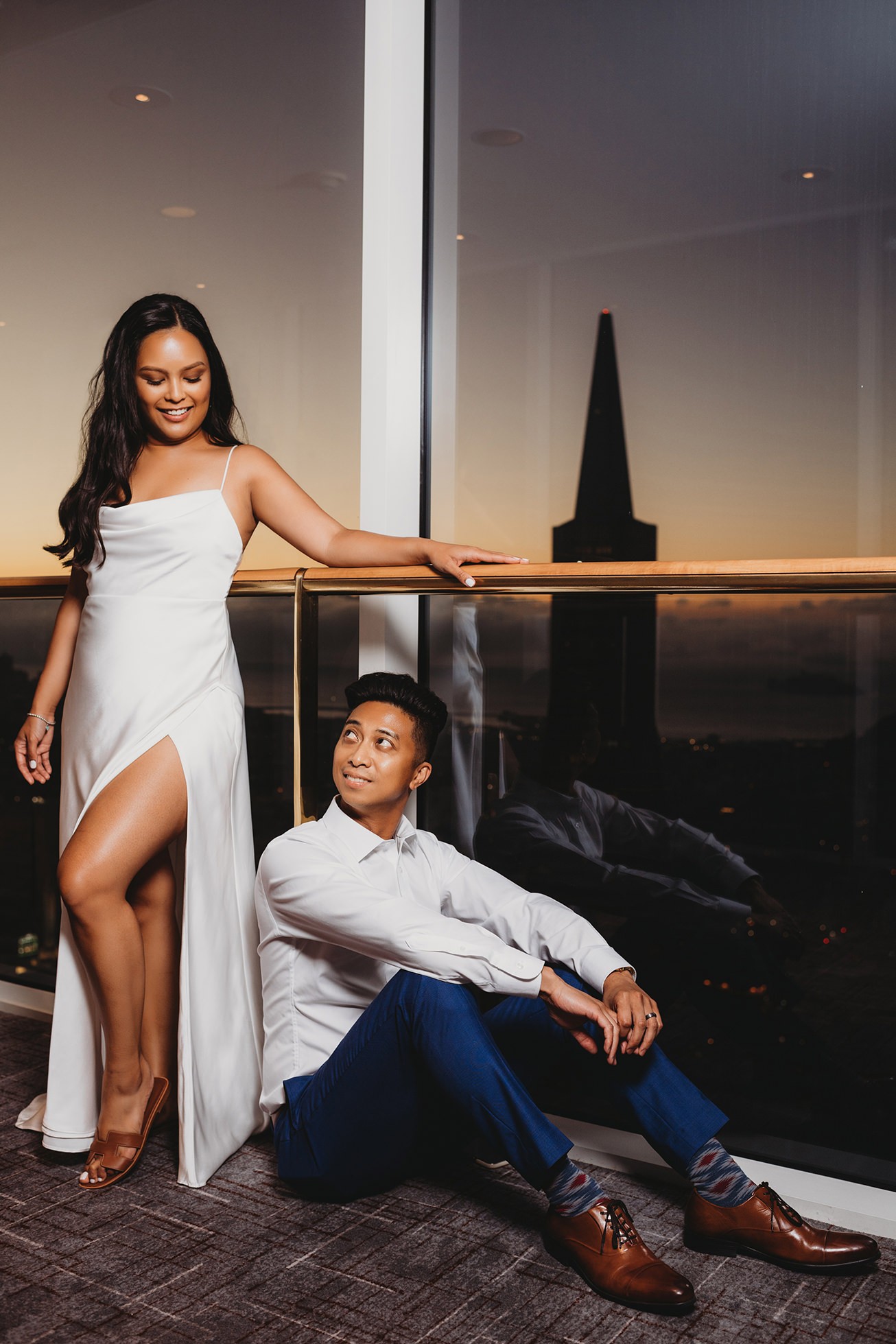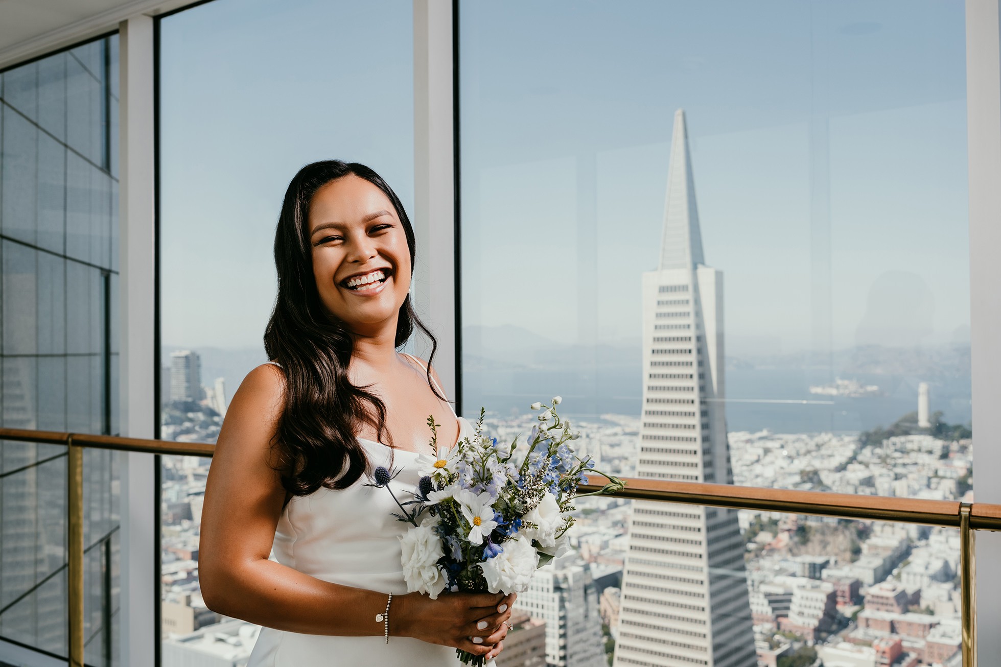 We finished their elopement story back at the hotel in one of the coolest spots: the skybridge hallway with glass walls. The sunset sky showed through the windows, and we were able to feature the San Francisco skyline behind them—an ending that felt modern, stylish, and unmistakably SF.
