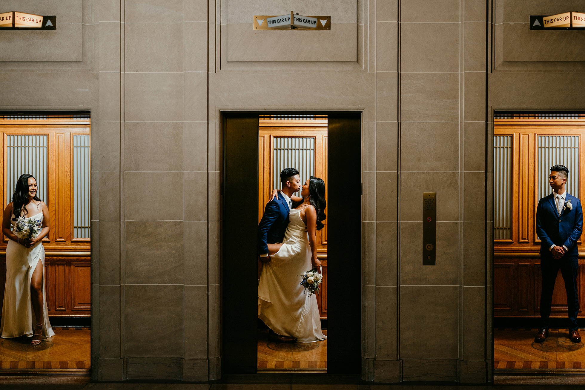 One of my favorite creative moments from their gallery is a photo collage in the elevators—modern, stylish, and a perfect contrast to the historic elegance of the building. We also captured them exiting through the main glass doors, which gave us that iconic “just married” energy with San Francisco right outside waiting for them.