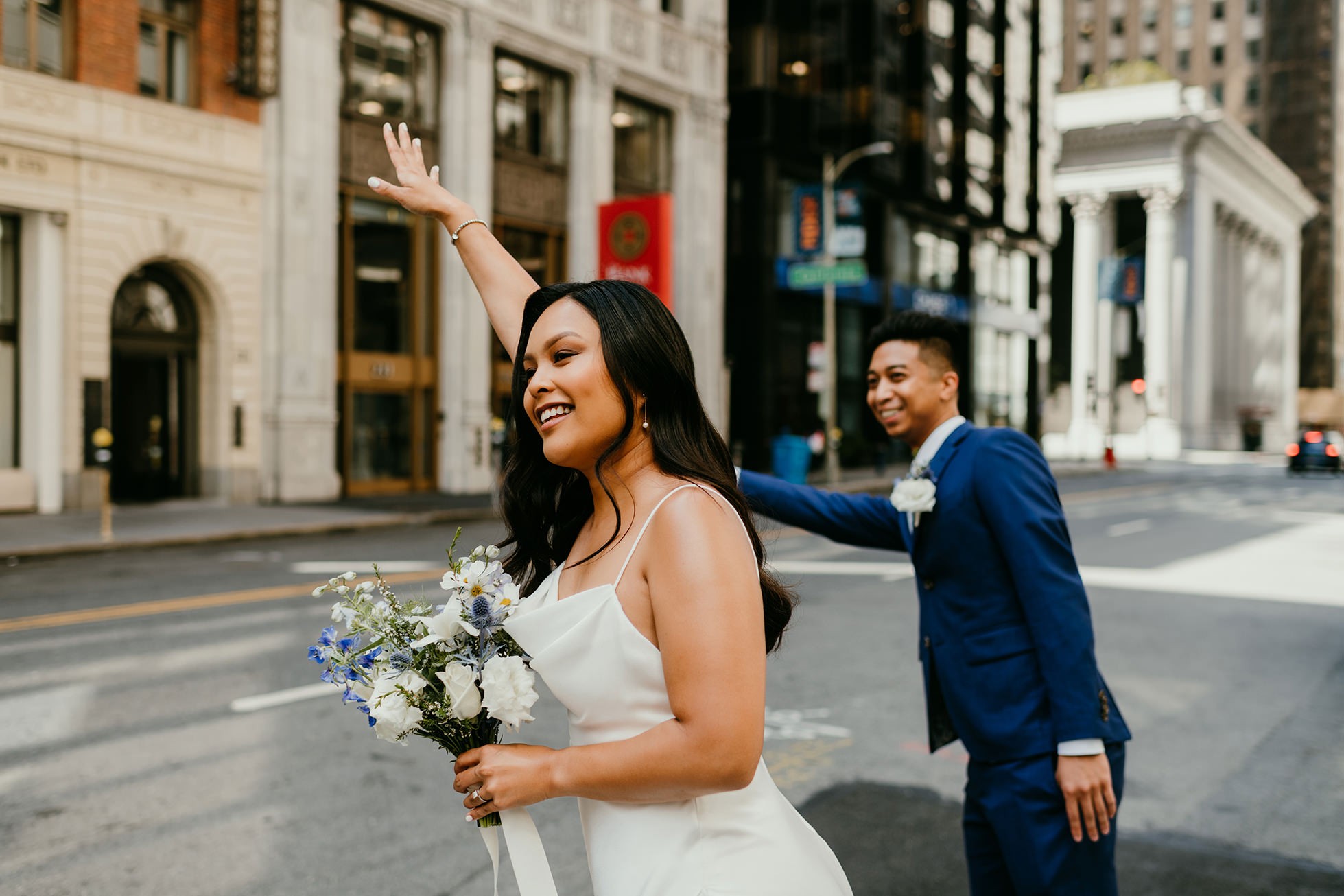 After they were ready, we stepped right out into downtown for portraits that felt cinematic and real. We photographed them in the streets as they hailed a taxi, which gave the day a true “San Francisco” feel—stylish, spontaneous, and effortlessly cool.